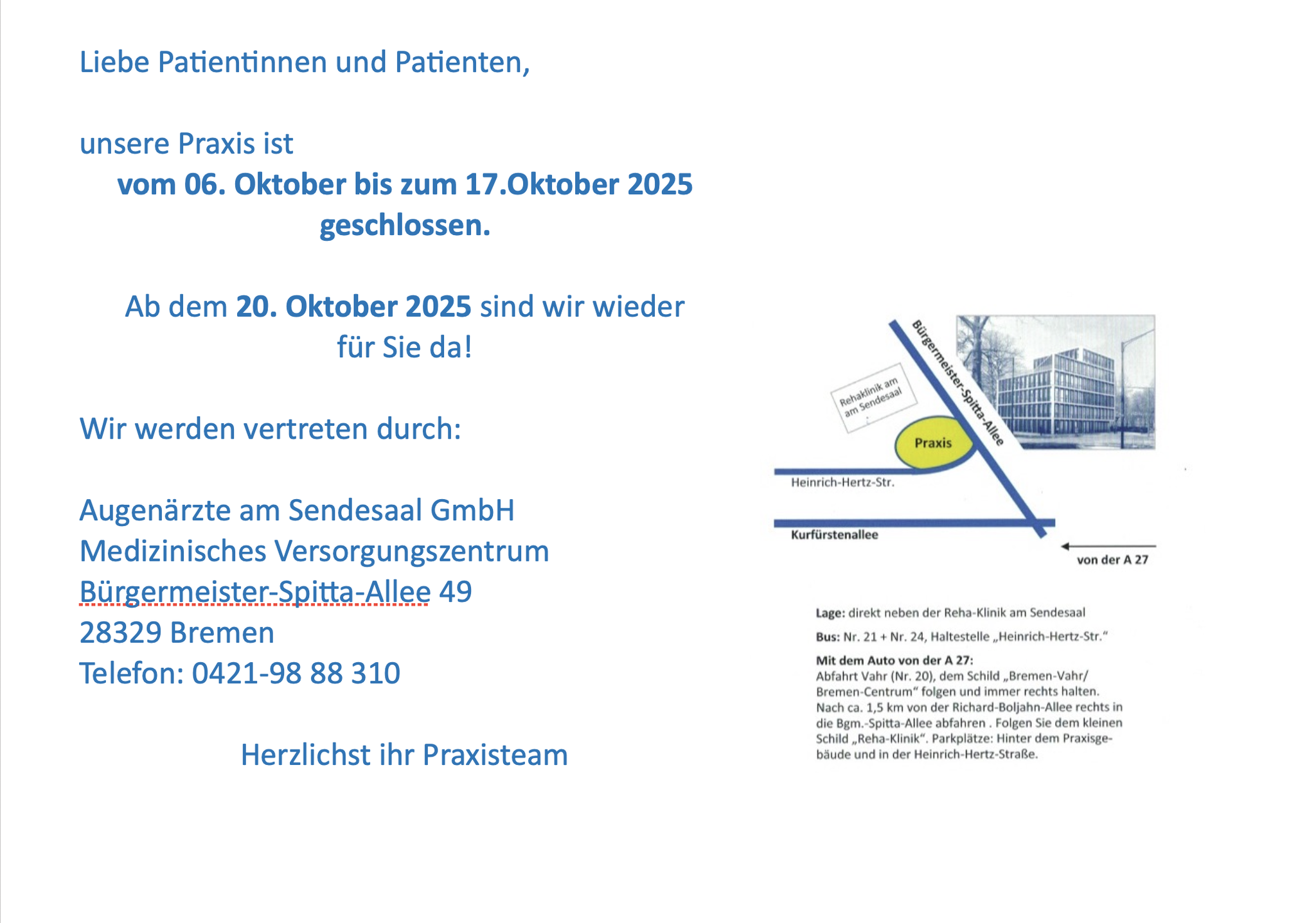 und nach Vereinbarung Zusätzlich: offene Sprechstunde tgl. 09:00-10.00 Uhr |